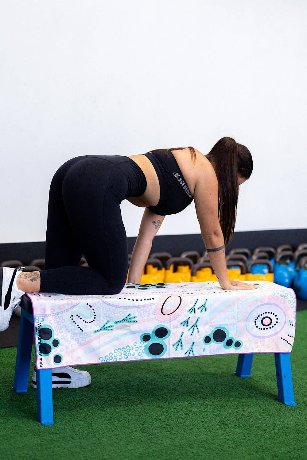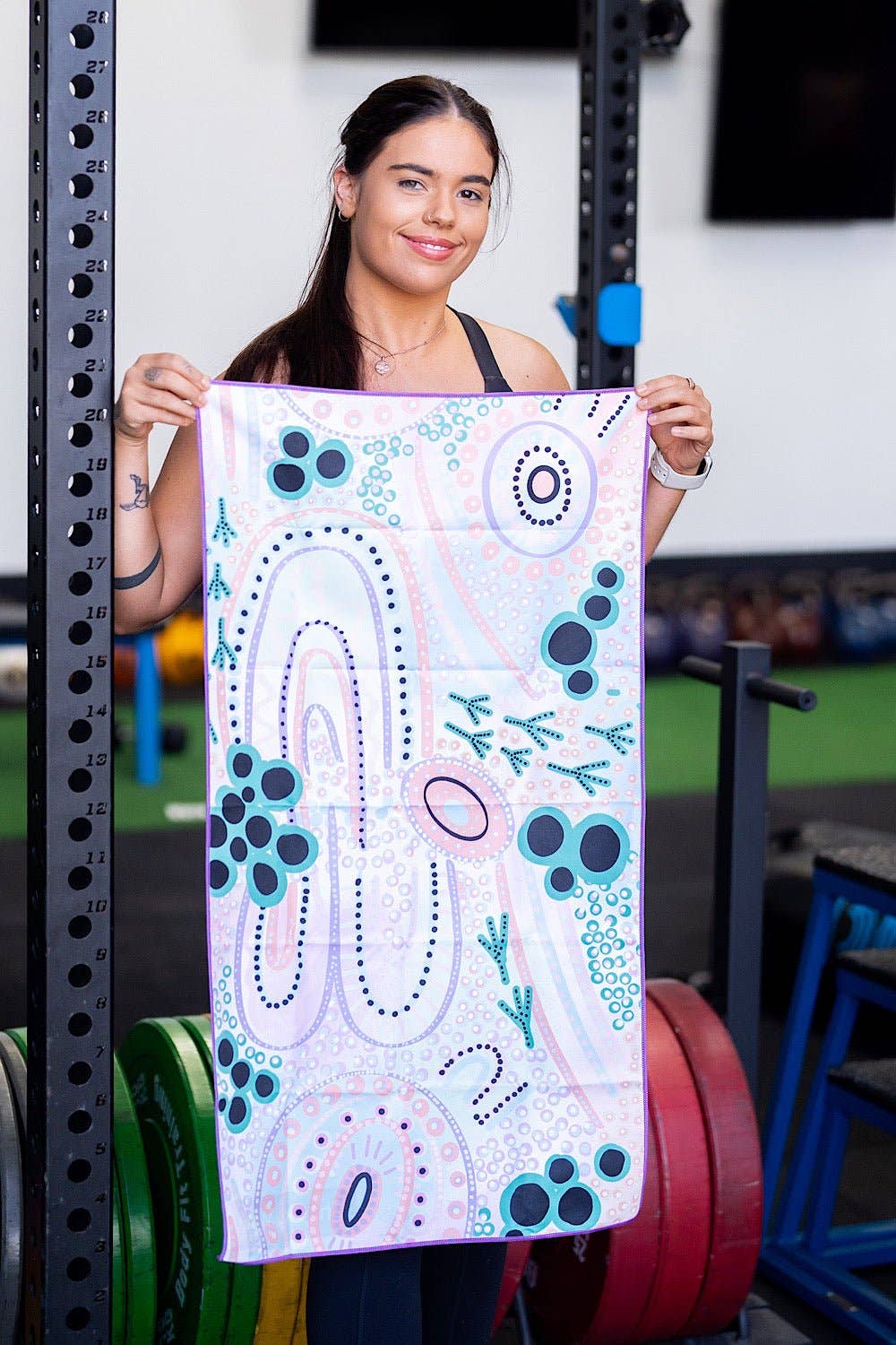 Experience the beauty of Indigenous art and culture with our "The Land and Sea " gym towel created by Indigenous artist Sheri Skele who is a proud Bidjara woman and a contemporary Aboriginal artist.